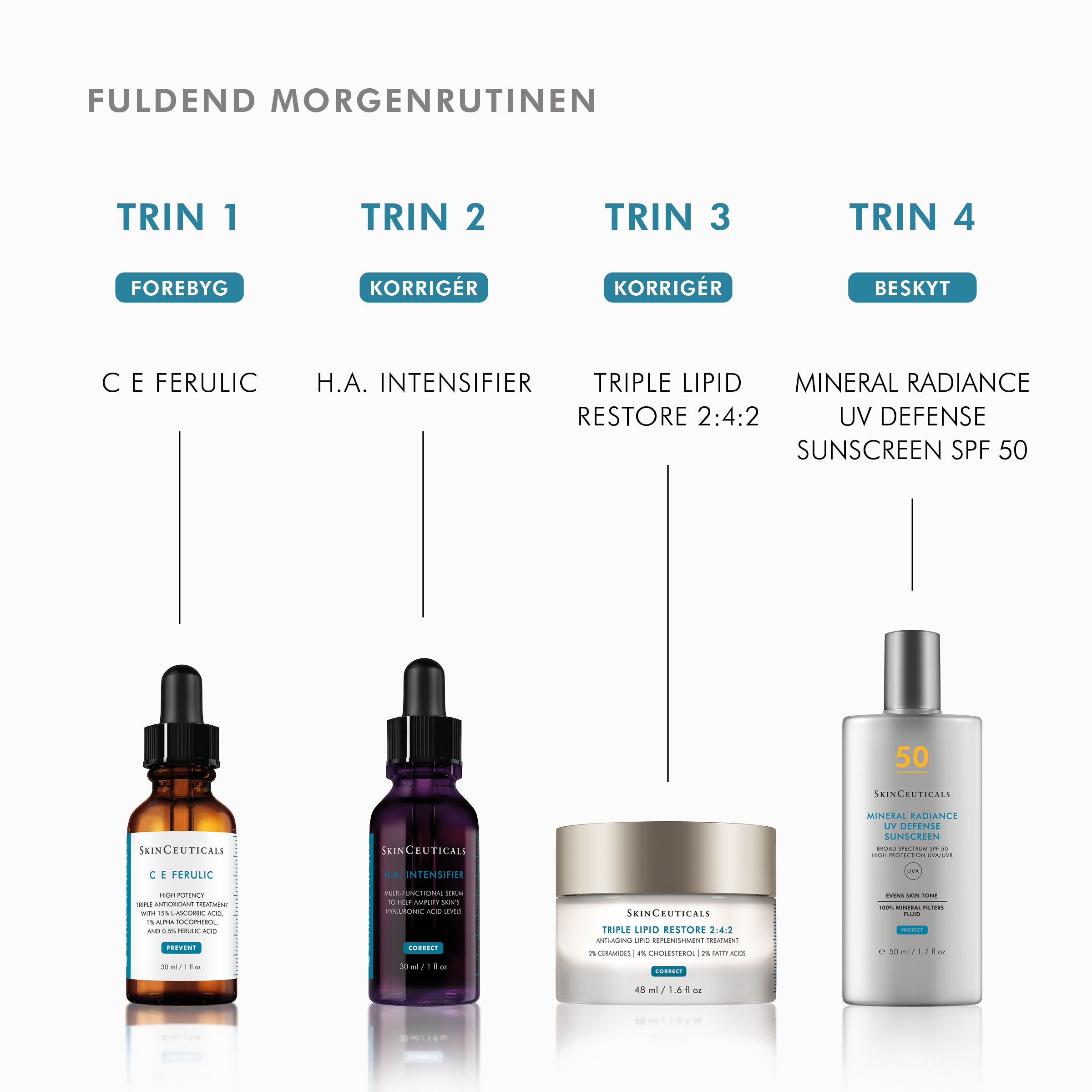 Serummet indeholder L-askorbinsyre, E-vitamin og ferulsyre. Den helt unikke formulering af potente ingredienser skaber synergi og gør C E Ferulic® til et effektivt forsvar mod frie radikaler.
