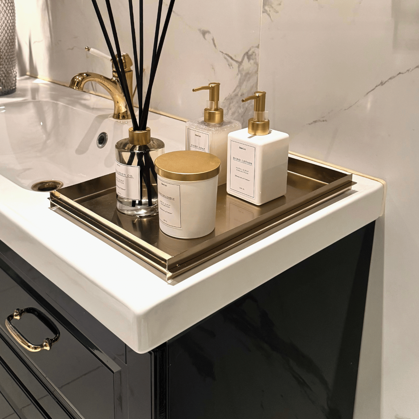 Et stilrent og sofistikeret designelement, der samler dine Essentials og løfter udtrykket med et strejf af gylden luksus.